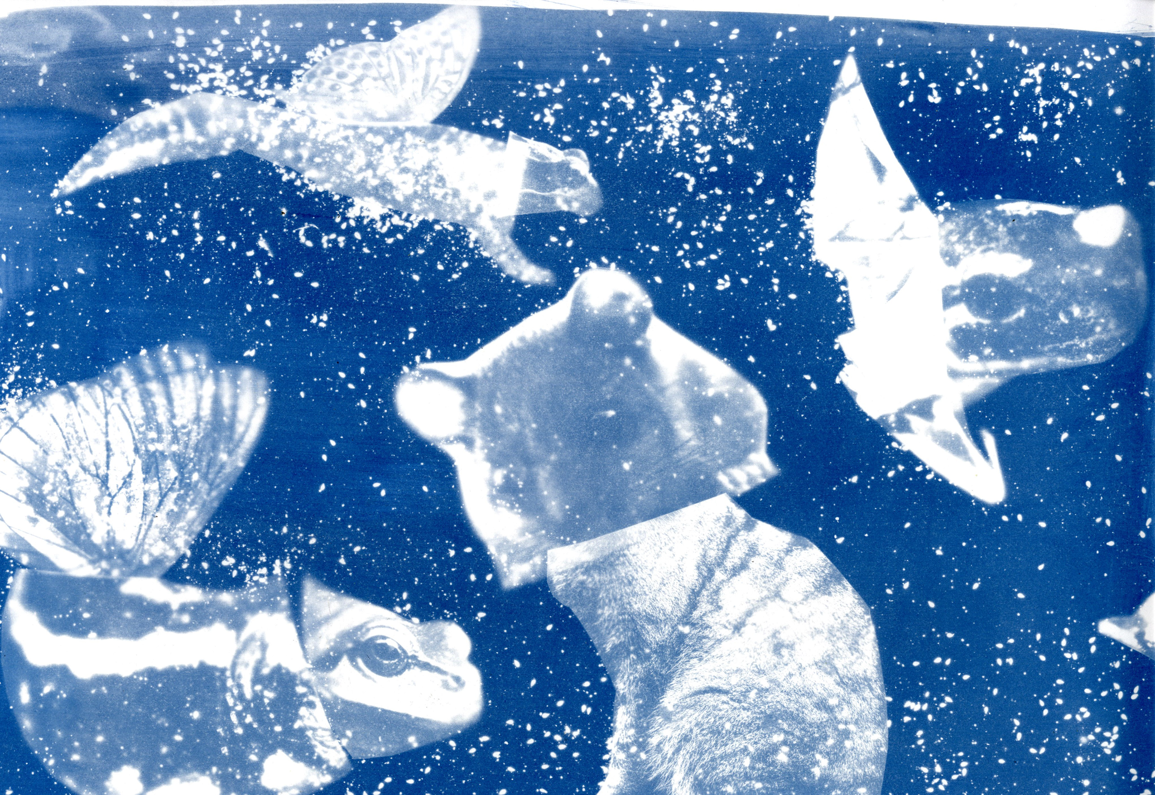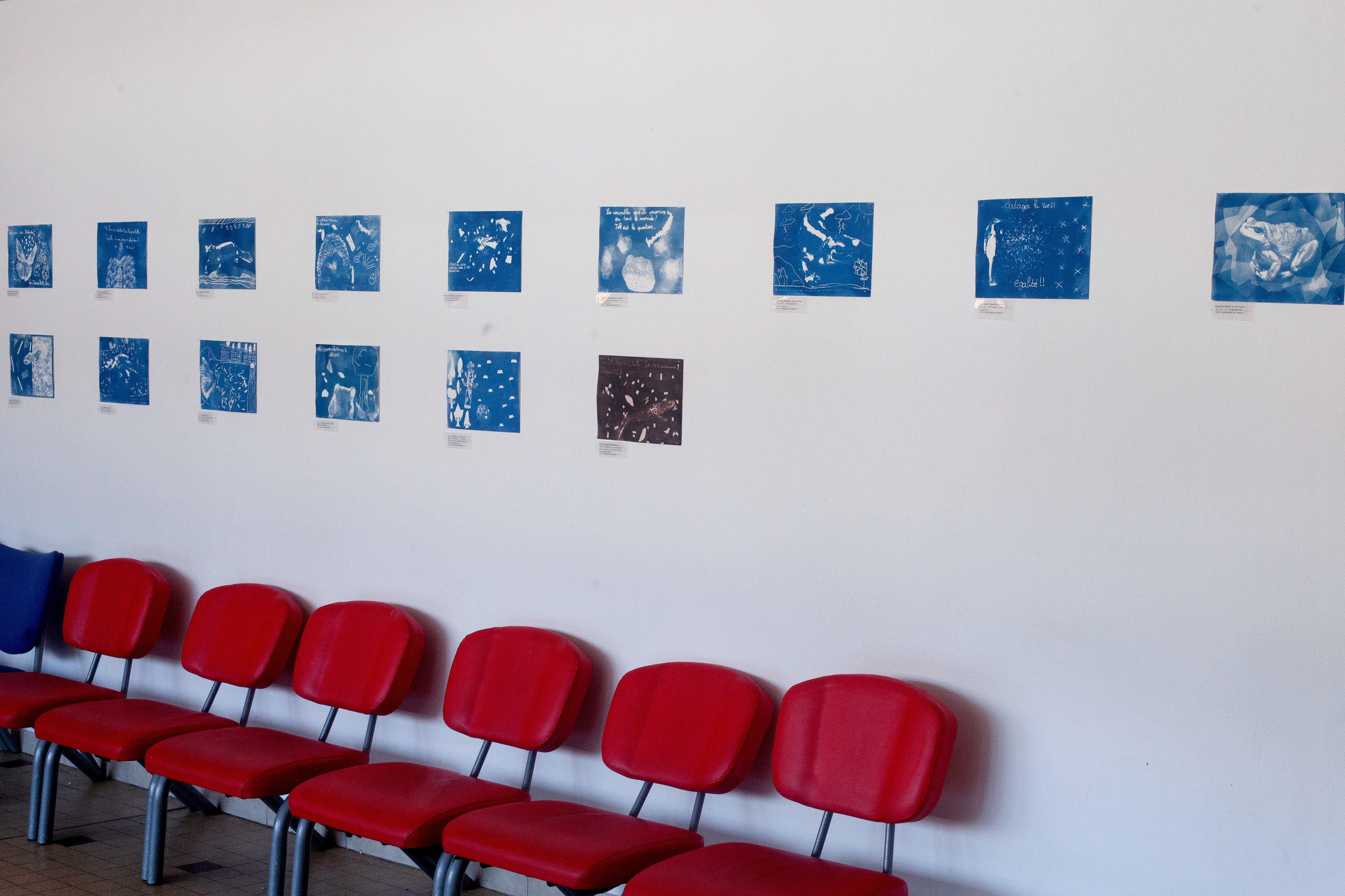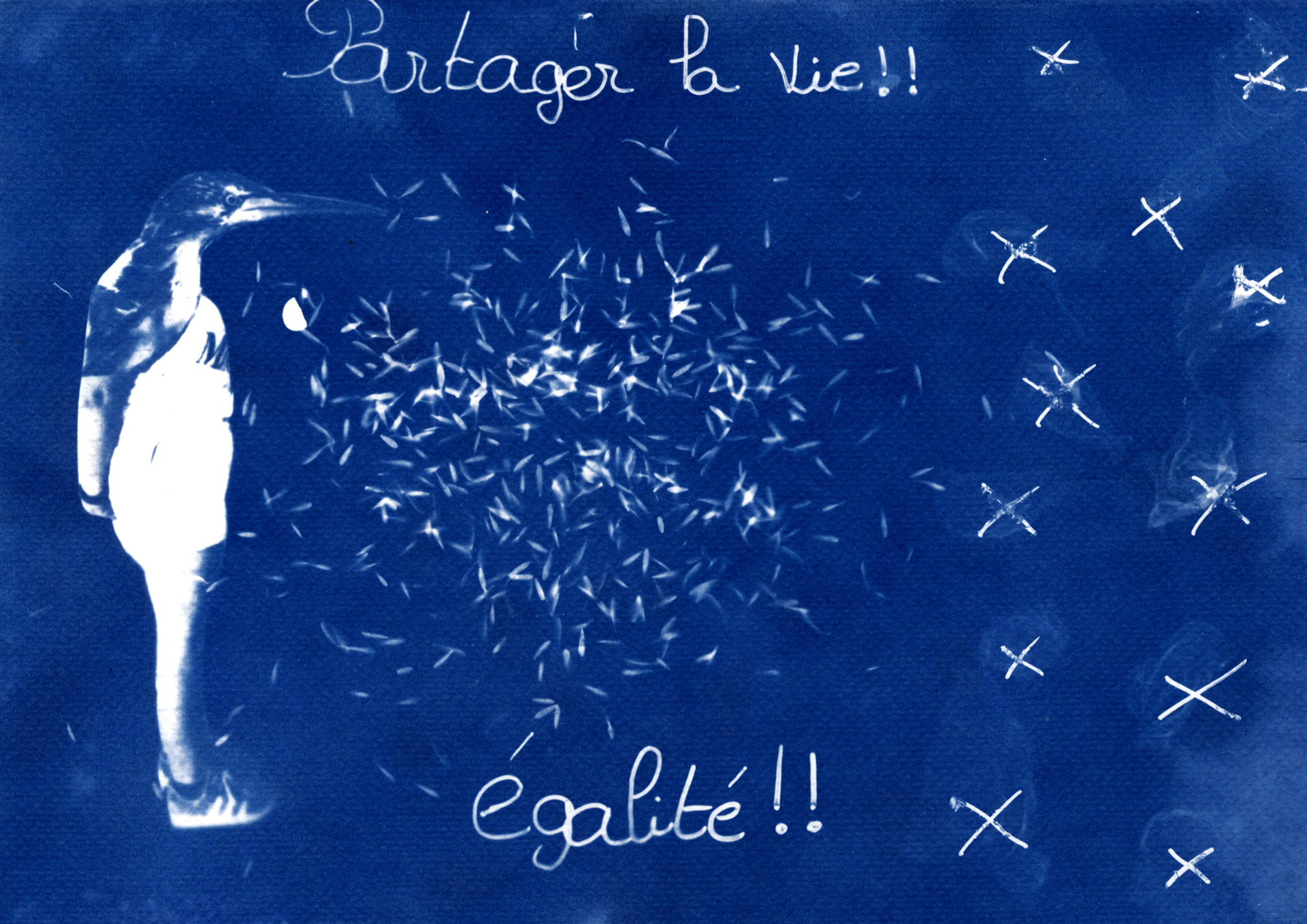 À travers le cyanotype, les élèves ont exprimé cette prise de conscience par des créations mêlant images, mots, dessins et éléments naturels, témoignant de leur regard sensible sur le monde vivant.