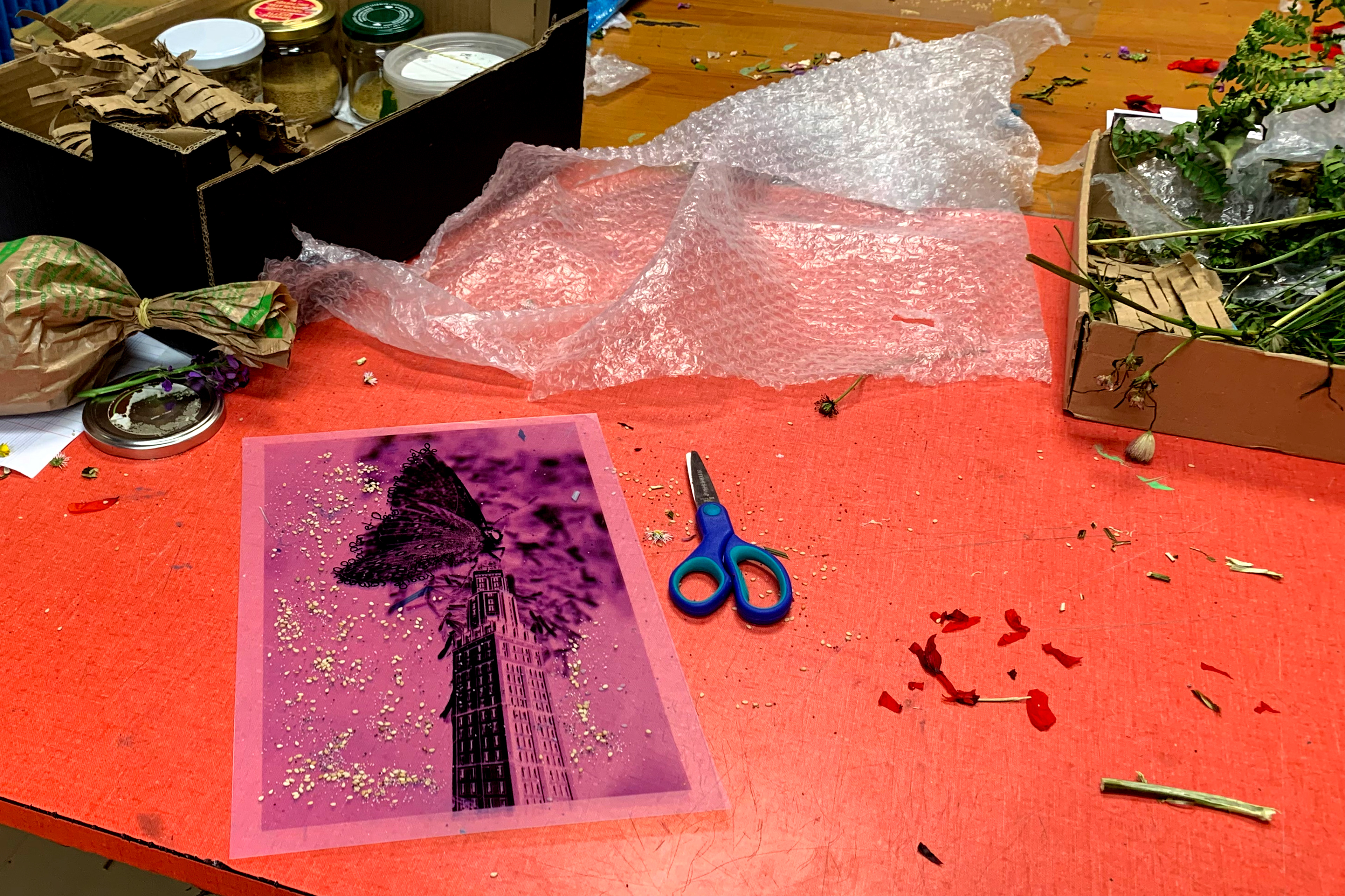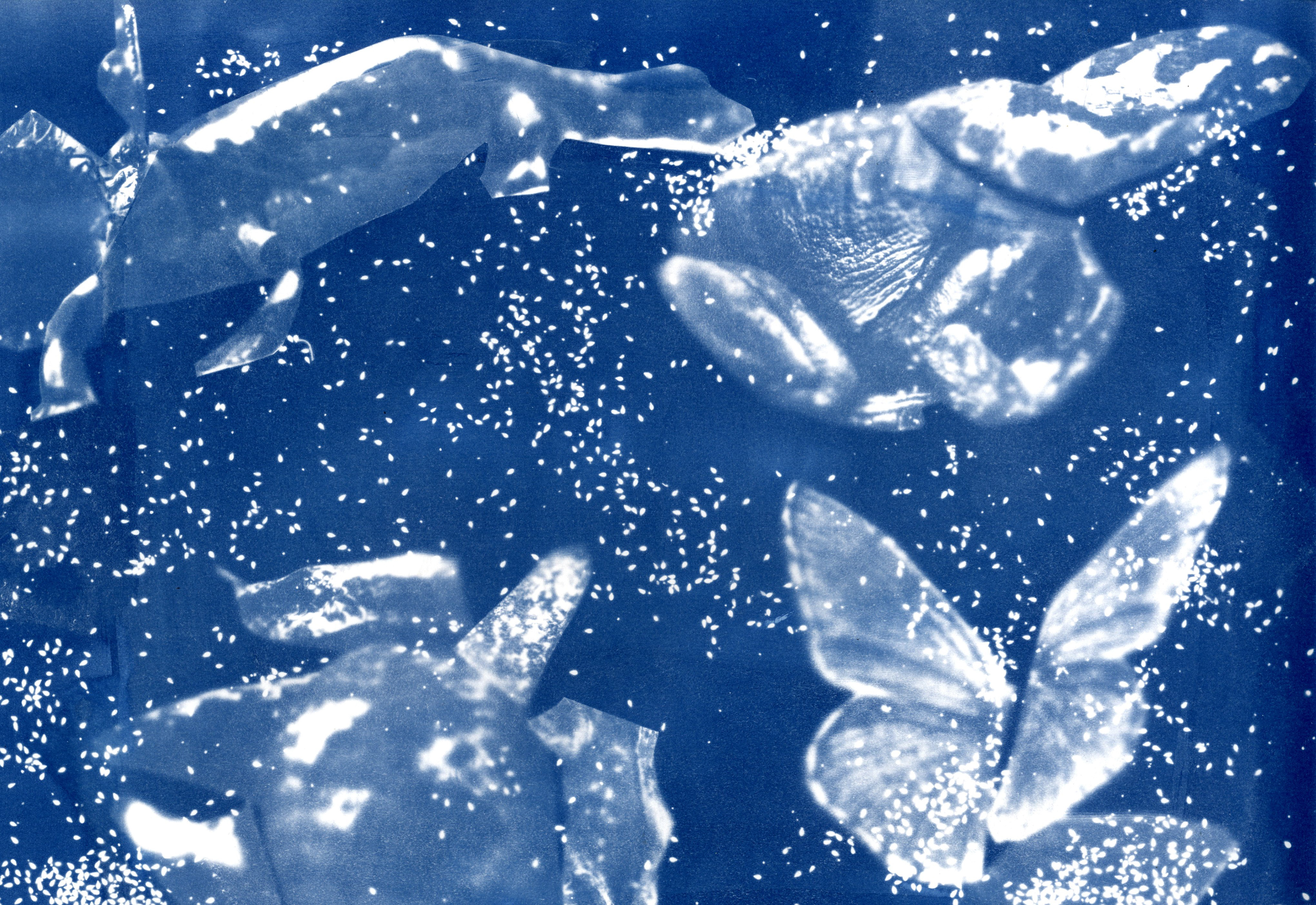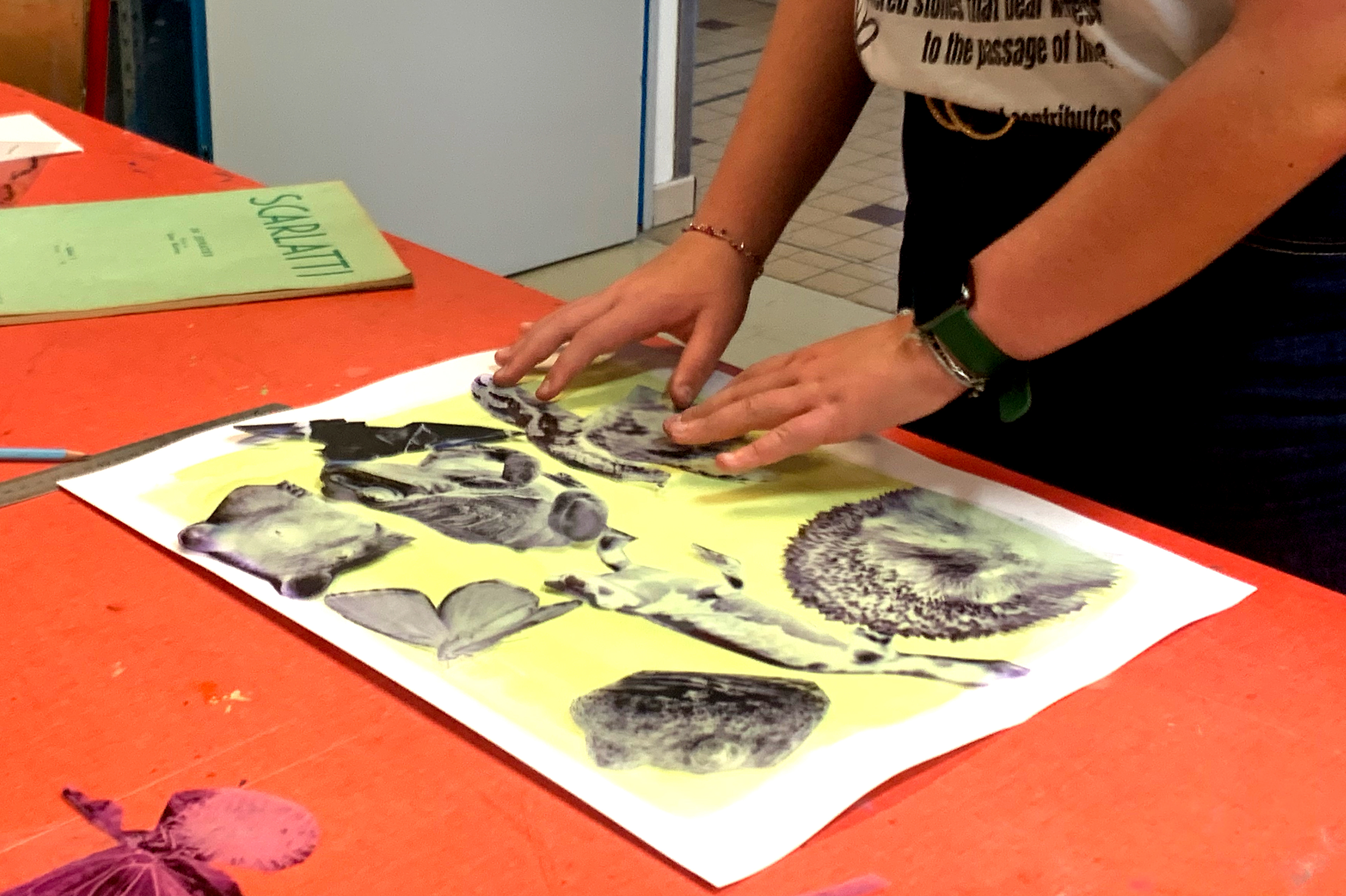À travers le cyanotype, les élèves ont exprimé cette prise de conscience par des créations mêlant images, mots, dessins et éléments naturels, témoignant de leur regard sensible sur le monde vivant.