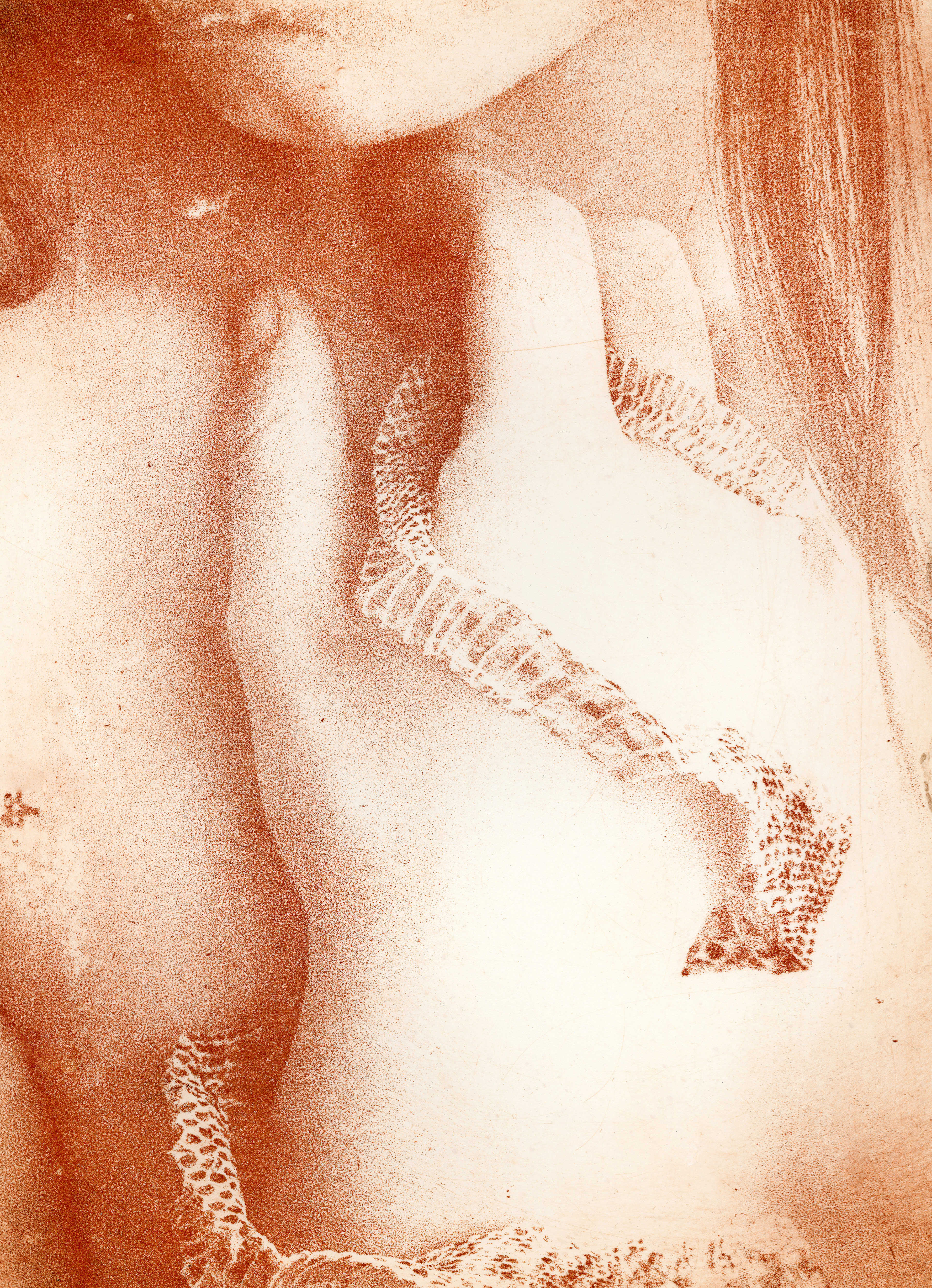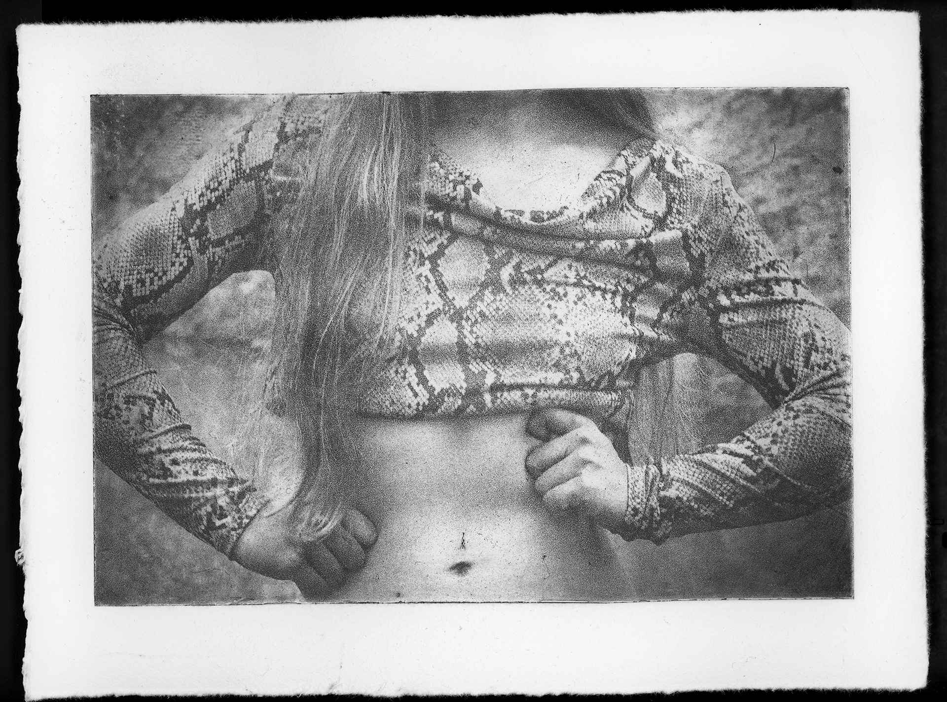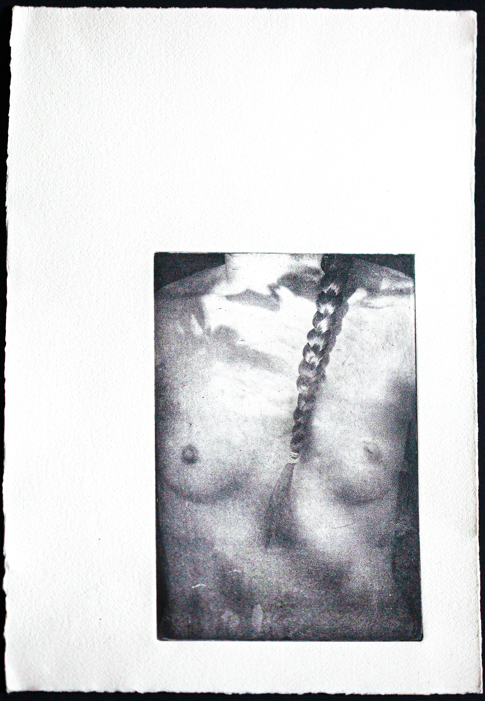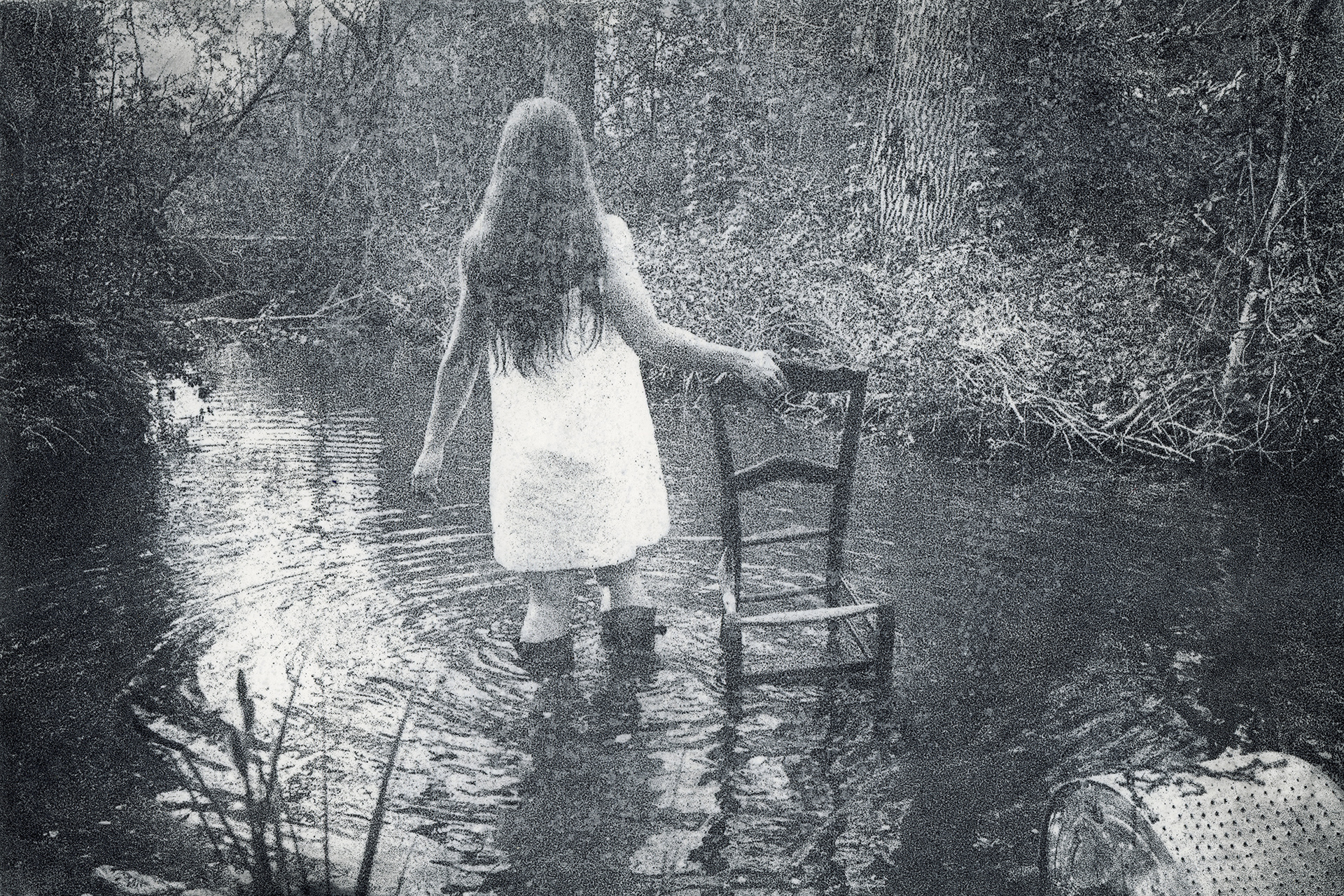 Le récit s’ouvre sur l’imaginaire du marais, lieu d’entre-deux où l’eau dormante enlace les îlots de terre. La consoude, plante locale, soigne et apaise. Ici vit Mélusine: femme-serpente capable de se régénérer dans l’eau. Entre créature féérique et monstre, puissance et mystère, le grain de sa peau s’hybride. Son corps reflète une identité multiple, mouvante et libre. Enchanteresse et symbole de métamorphose, elle efface les frontières, redéfinit l’altérité et questionne la norme. Dans l’intemporalité, les photographies de la muse sont pressées avec force sur le papier, permettant ainsi un dialogue entre photographie contemporaine et mythe. Comme un décor vivant, des éléments du marais apparaissent dans des photographies développées à la consoude. Entre mythe et matière, une ode à l’icône médiévale prend forme et résonne en chacun·e.