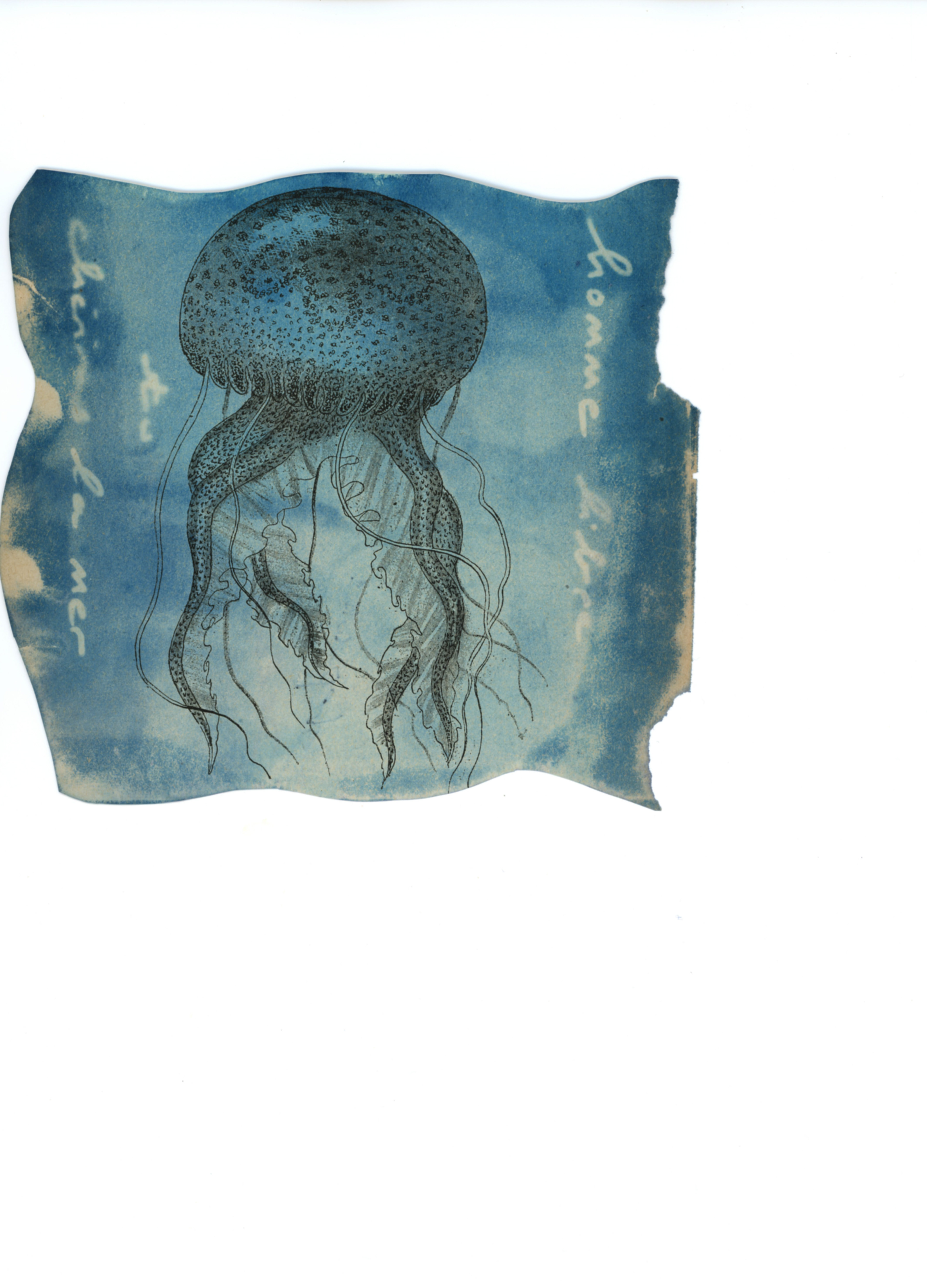 Des pages blanches et une veille encyclopédie ont été utilisées comme support d’impression. Des pochoirs, des mots et des formes sont venus agrémenter les compositions d’algues et de déchets humains ramassés sur l’estran. Dans certains cas, le cyanotype a été viré par des bains de teintures naturelles à la poudre de rose, de blé, d’avocat ou du thé.