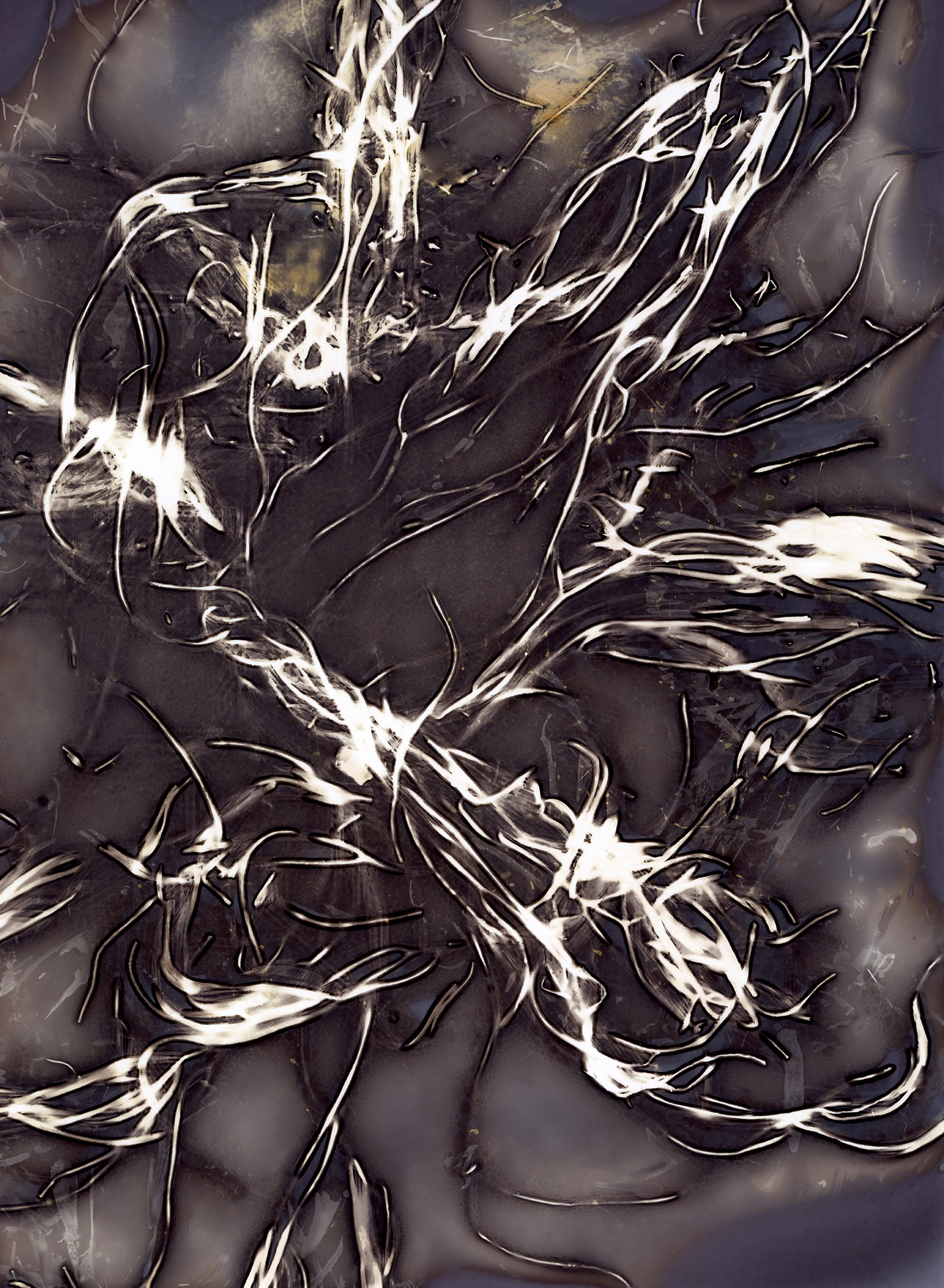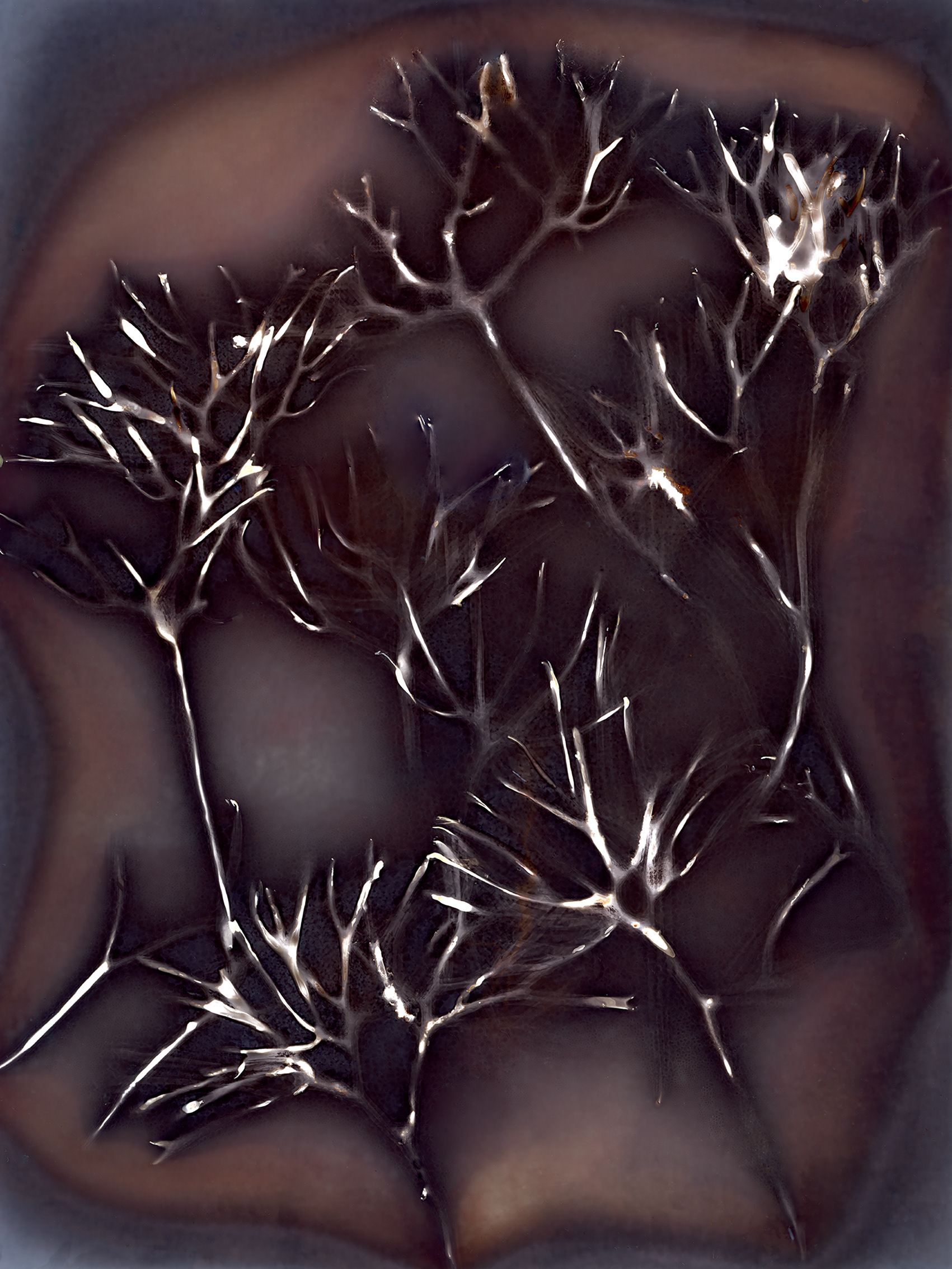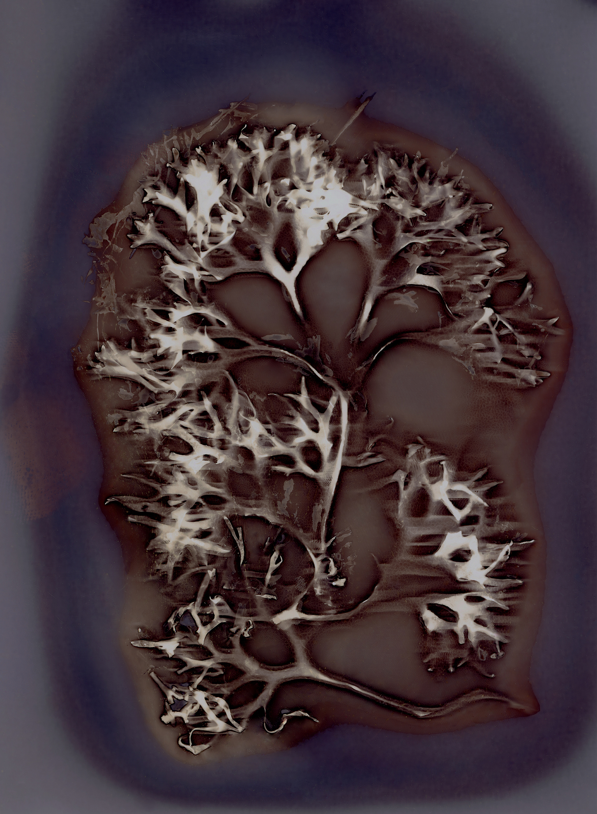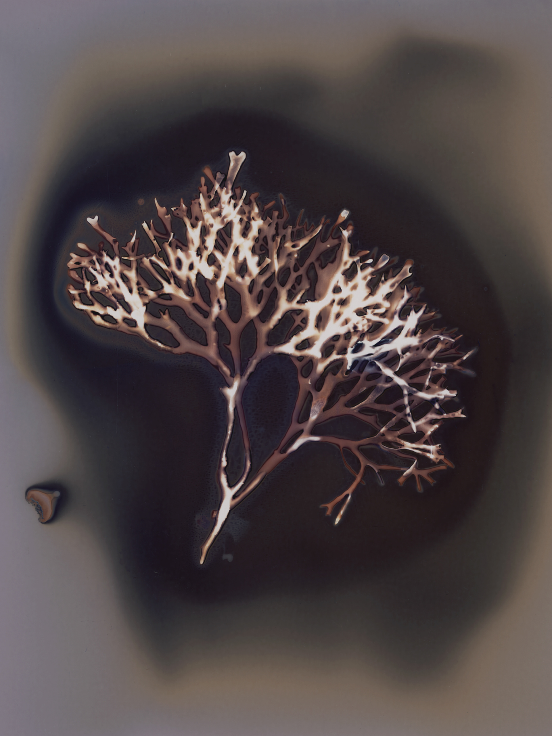 Insolant par contact un papier photosensible, Mélanie a réalisé des empreintes d’algues. Une transformation de notre monde perceptif qui le rend mystérieux et familier comme cette matrice minérale et biologique qu’est l’estran. Une mise en forme qui désigne notre rapport contradictoire au vivant : nous en faisons partie mais pour le « re-connaître » nous devons passer par le biais de connaissances et de techniques, par une médiation. Un tribu à la mer nourricière!