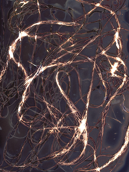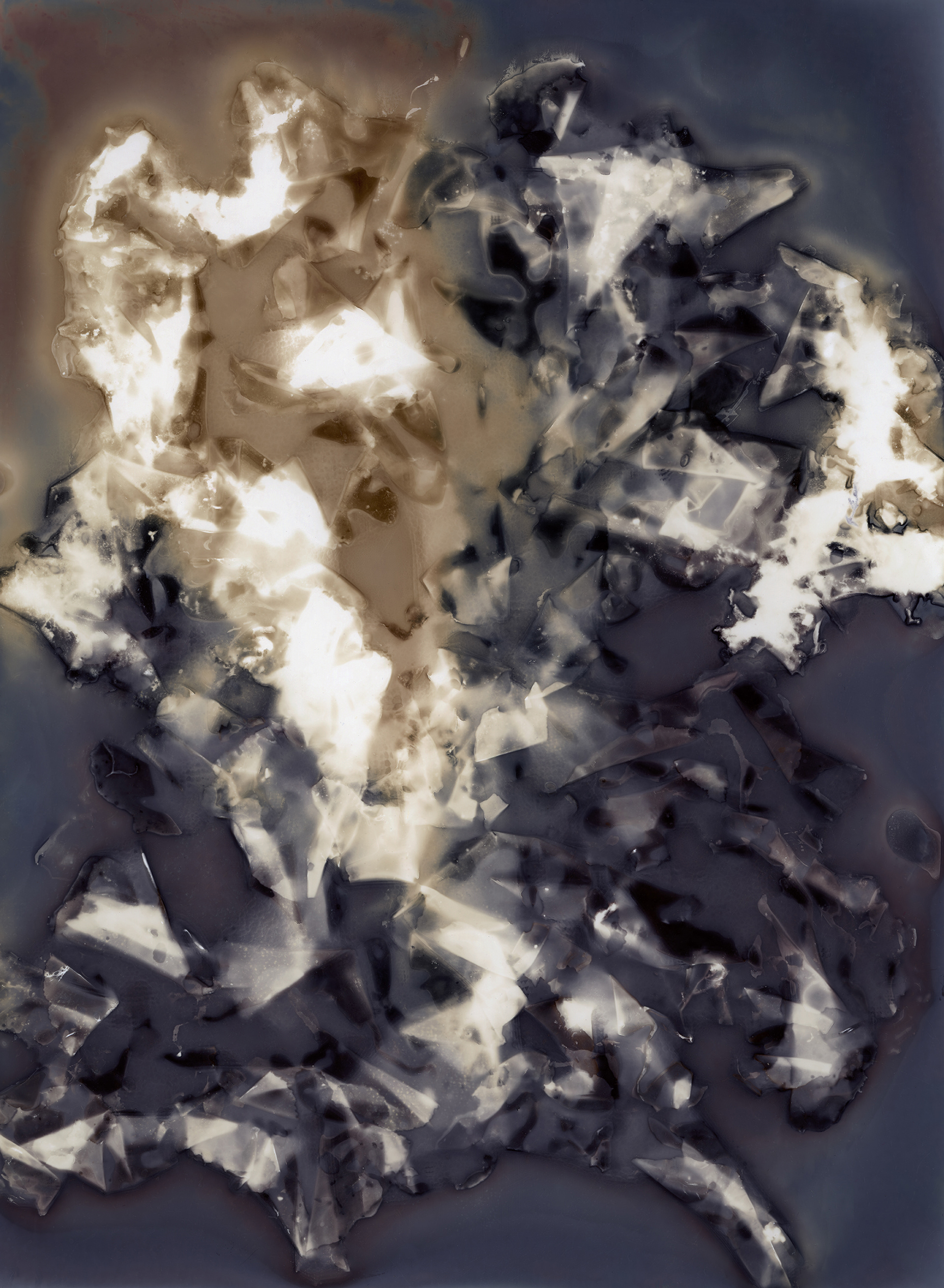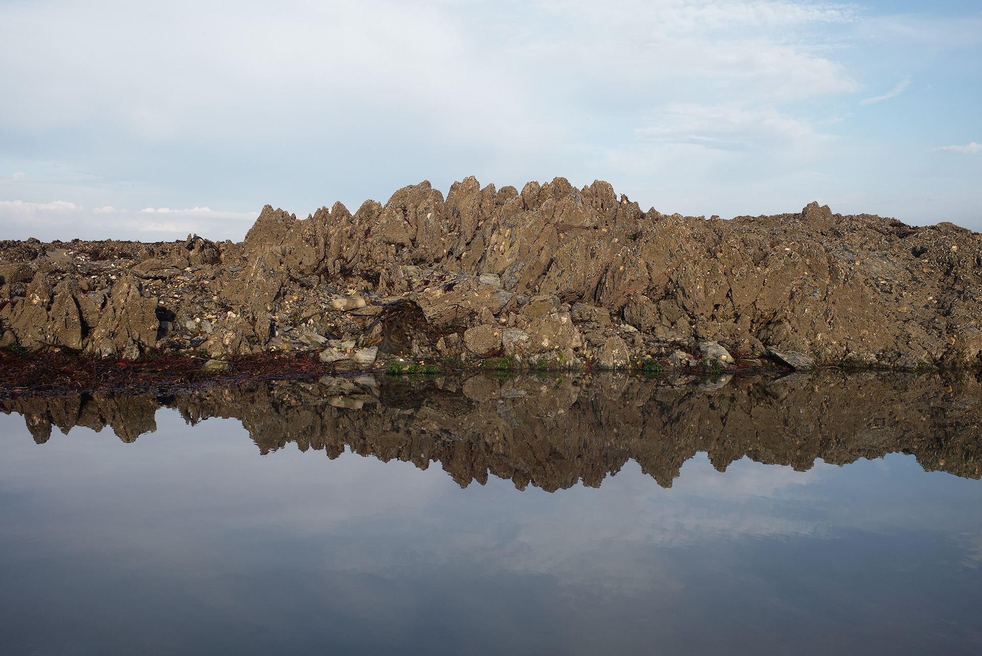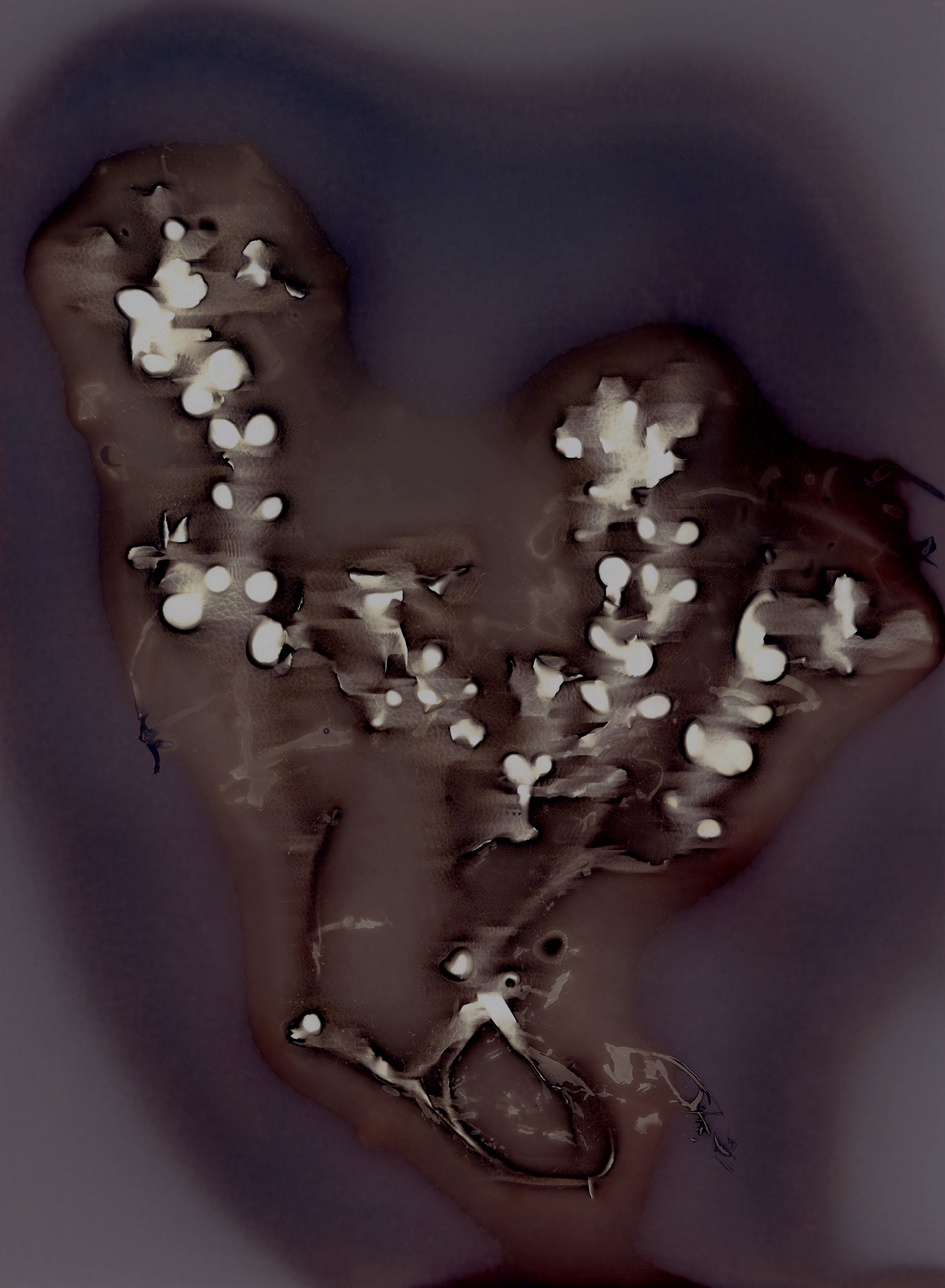 Insolant par contact un papier photosensible, Mélanie a réalisé des empreintes d’algues. Une transformation de notre monde perceptif qui le rend mystérieux et familier comme cette matrice minérale et biologique qu’est l’estran. Une mise en forme qui désigne notre rapport contradictoire au vivant : nous en faisons partie mais pour le « re-connaître » nous devons passer par le biais de connaissances et de techniques, par une médiation. Un tribu à la mer nourricière!